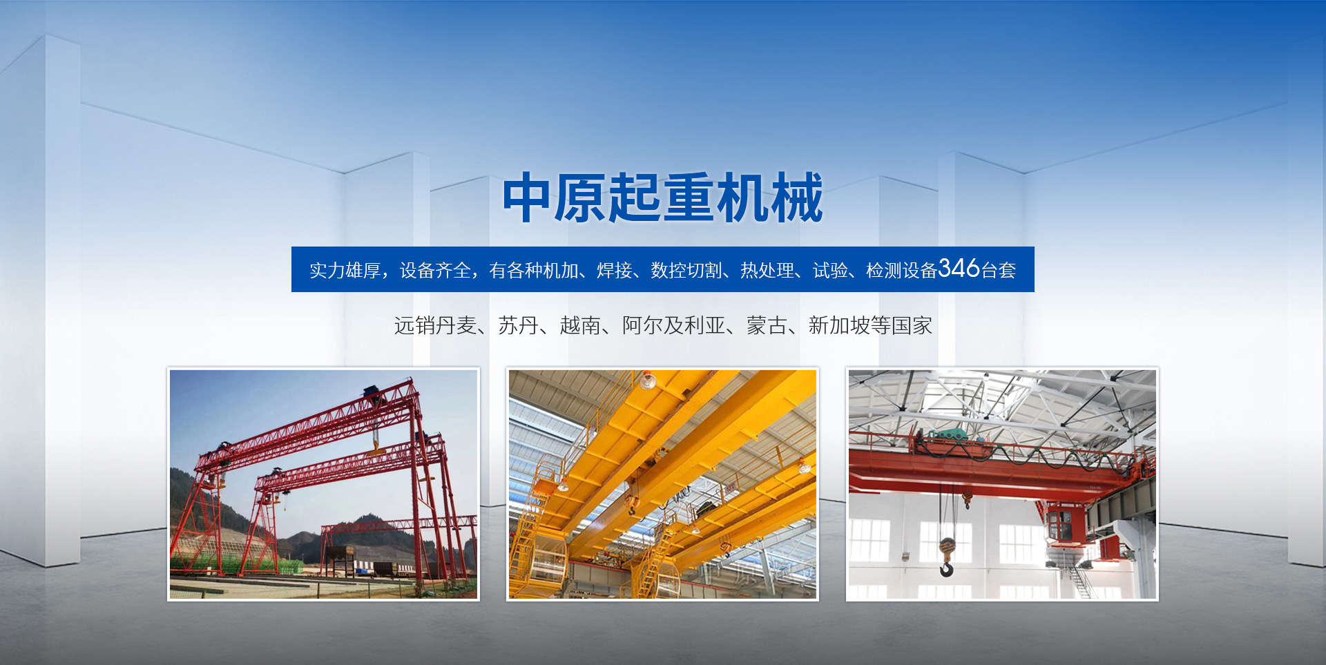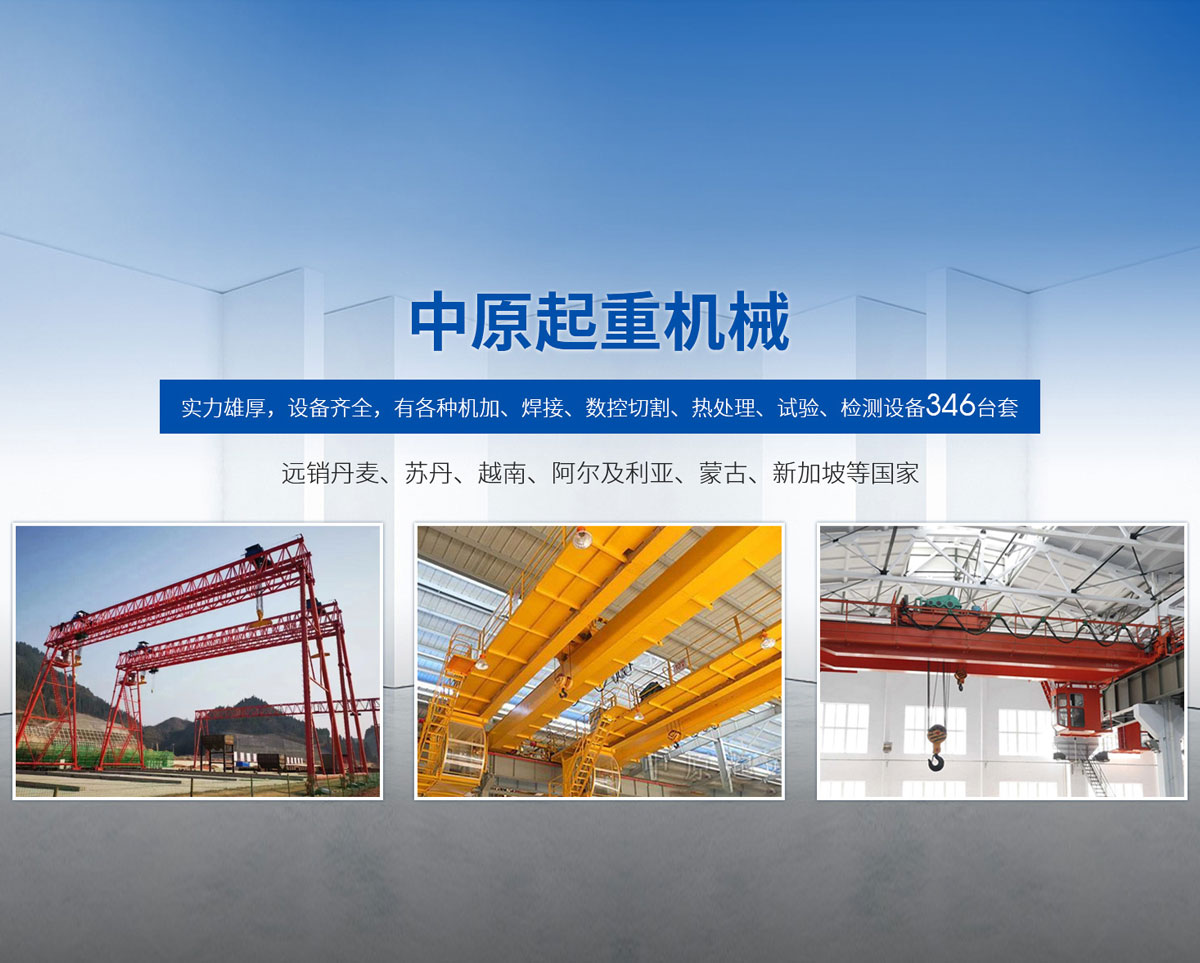 新鄉市中原起重機械有限公司成立于2000年,地處中原,輻射全國28個省市自治區,設外埠經銷處、辦事處268個。產品行銷工礦、建材、化工、冶金、電力、交通、鐵路、油田、港口等各個行業。遠銷丹麥、蘇丹、越南、阿爾及利亞、蒙古、新加坡等國家?! 」緦嵙π酆?,設備齊全,有各種機加、焊接、數控切割、熱處理、試驗、檢測設備7臺;有機加工、熱處理、單、雙梁橋門機生產、檢測、安裝等9個車間,研究中心、運輸公司、安裝維修服務公司等機構,?  主要產品有:LD型1~20噸電動單梁起重機系列產品;5~600噸通用橋式、門式、冶金、上旋轉下旋轉電磁吊、絕緣、抓斗、防爆起重機系列產品;LH3~100噸葫蘆雙梁系列產品;MH5~32噸葫蘆門式系列產品;0.5~40噸CD1、MD1鋼絲繩電葫蘆系列產品;HS1型0.5~20噸手動葫蘆系列產品;0.5~10噸環鏈電動葫蘆系列;0.5~40噸彎道電動葫蘆系列產品;裝卸橋、造船門機、架橋機、鑄造吊和水電大噸位起重機系列產品。  公司建立了強有力的質量保證體系和生產過程的質量控制系統,嚴格執行國家設計、生產標準,有嚴格的生產工藝過程和標準,嚴格的檢驗、檢測標準和手段。